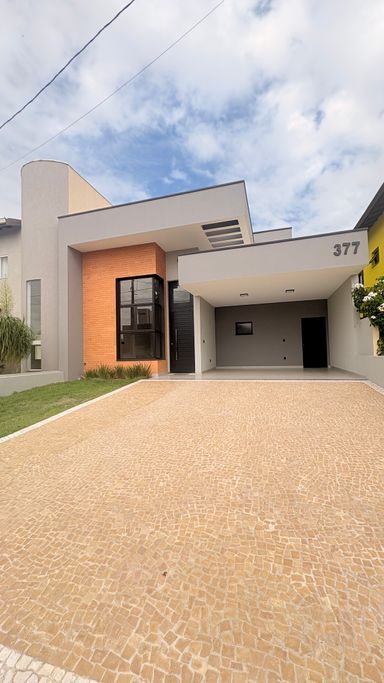 Casa à venda no Condomínio Terras da Estancia - Paulínia/SP 🛌 3 dormitórios (1 suíte master com closet amplo) 🛋️ Sala ampla 🍽️ Cozinha moderna planejada com ilha, (fogão cooktop, coifa sob medida, 🥩 Churrasqueira integrada com a cozinha, AR condicionado em todos ambientes Lustre, 1 escritório, quintal, Piscina 🧺 Lavanderia espaçosa 🚗 Garagem para 4 carros (2 cobertas), Janela e portas em vidros, ✨ Banheiros de alto padrão: ✔️ Revestimentos nobres ✔️