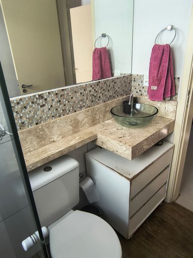 Apartamento com dois dormitórios com armários, banheiro social com gabinete e box blindex, cozinha americana com planejados, ventilação e luz natural.