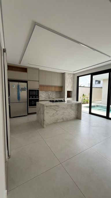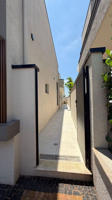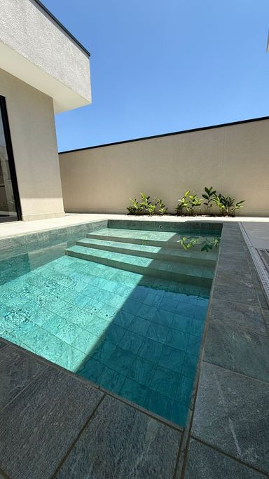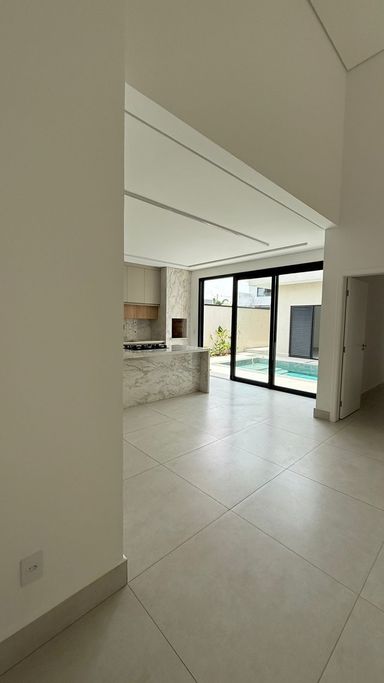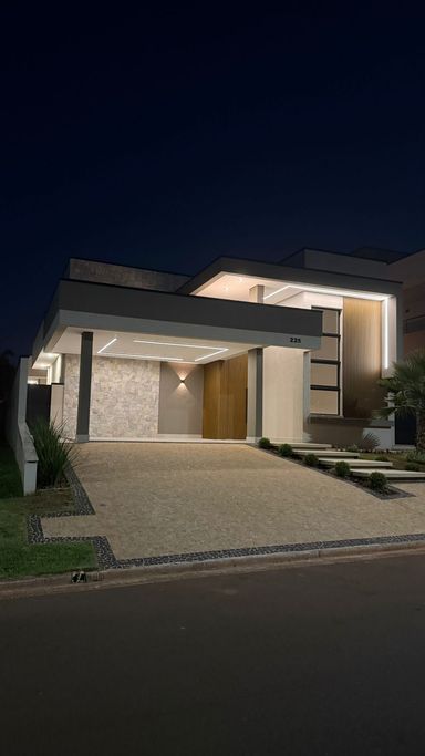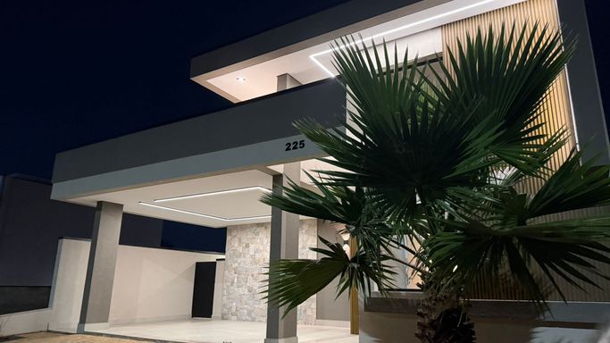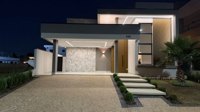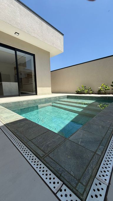 Casa térrea no condomínio Terra dos Cancioneiros, com 205 metros de construção, terreno de 390 metros, com 3 suítes, 5 banheiros, Sala, copa, cozinha gourmet, Lavanderia, Dispensa, piscina aquecida, repleta em armários de grife Simonetto, porcelanato Portobello e Portinari, fino acabamento, Mármore Branco Paraná, Travertino Romano, e Quartzo Branco, metais Deca, aquecedor solar, preparação para ar condicionado, já equipada com geladeira, microondas, forno, cooktop. Projeto moderno e diferenciado, com pé direito duplo, ventilada e arejada.