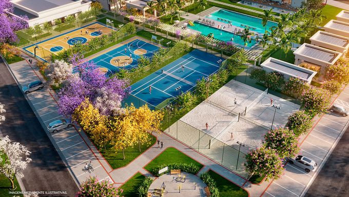 Em frente a principal área do condomínio que é a área de lazer, perto da entrada na principal rua, que é mais larga, com canteiro central, tendo mais locais para estacionar por perto.