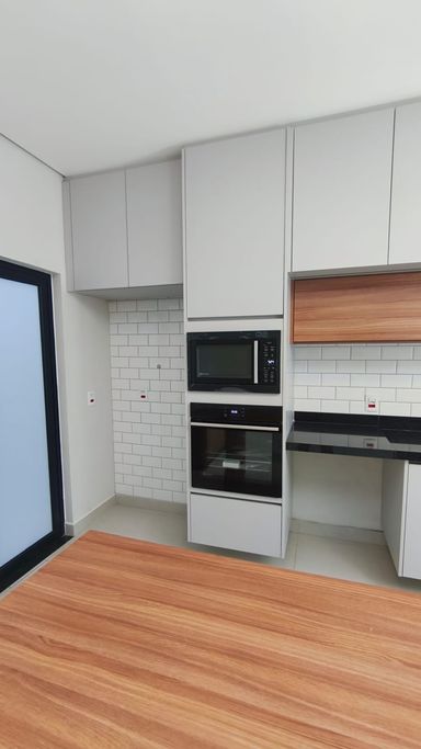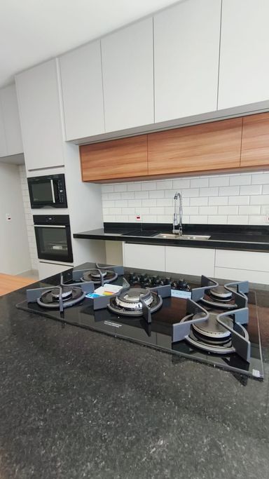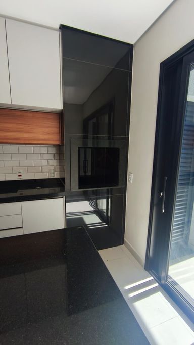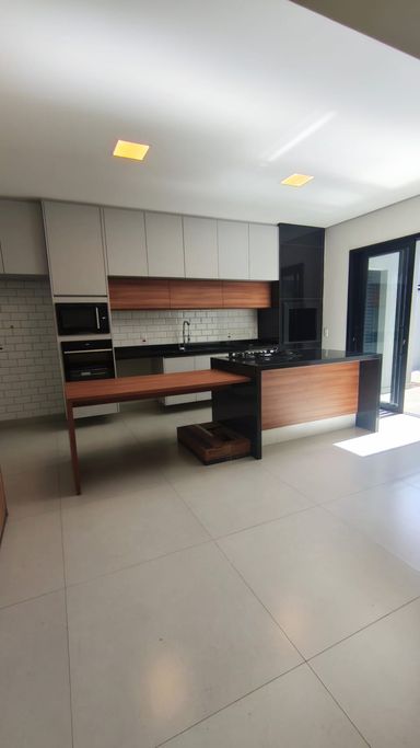 - Cozinha planejada com forno, fogão, microondas e churrasqueira.